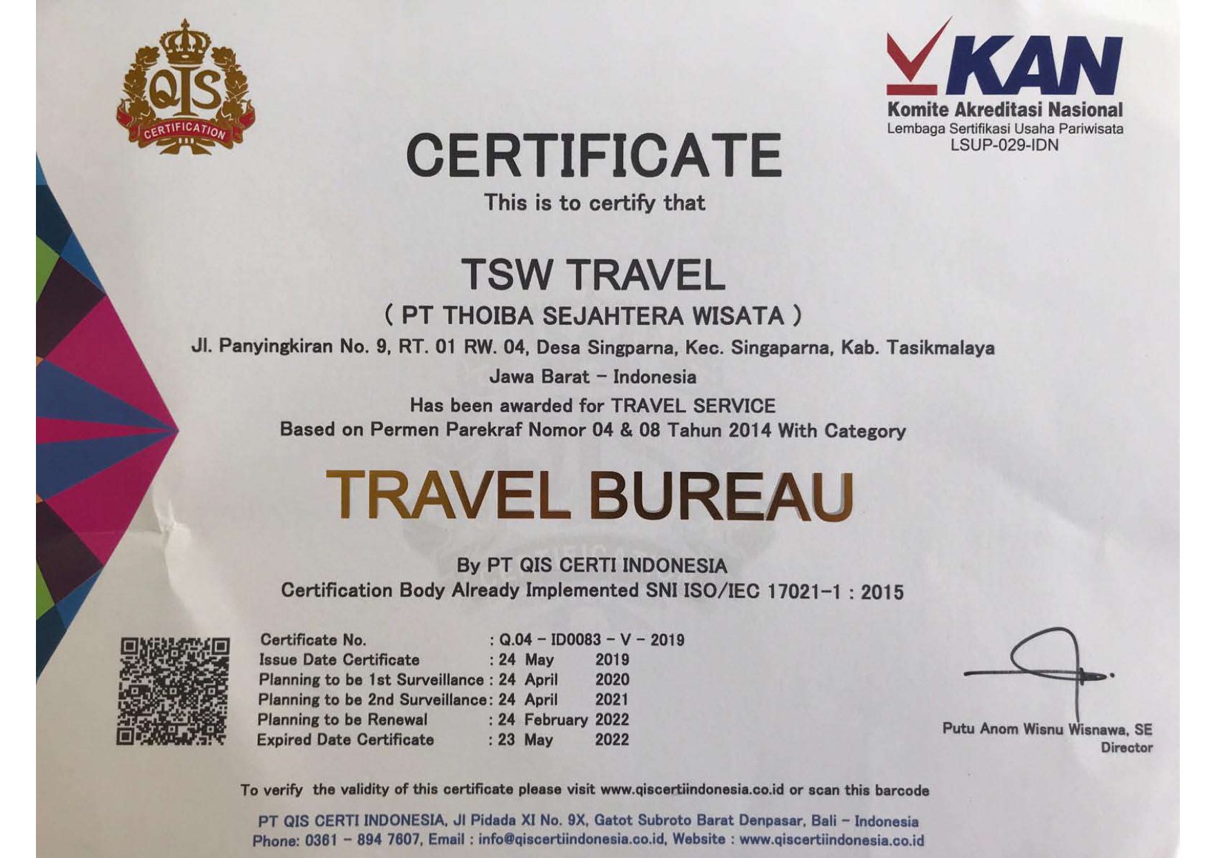 PT. Thoiba Sejahtera Wisata atau biasa disebut dengan TSW Travel merupakan PPIU (Penyelenggara Perjalanan Ibadah Umrah) yang memiliki izin resmi dari Kementerian Agama Republik Indonesia dengan nomor izin UU.535 Tahun 2020. TSW Travel telah beroperasi sejak tahun 2016 yang berpusat di Singaparna, Kabupaten Tasikmalaya.
